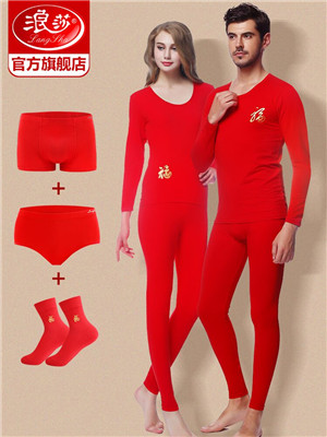 浪莎本命年红色内衣内裤袜子结婚礼物属牛秋衣秋裤男女士保暖套装
